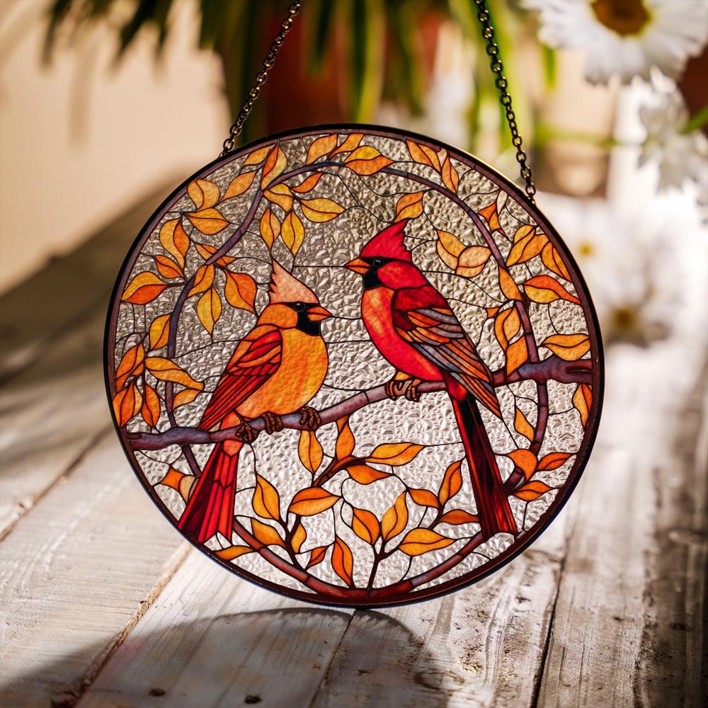 Couple Red Birds Flowers Stained Glass Suncatcher