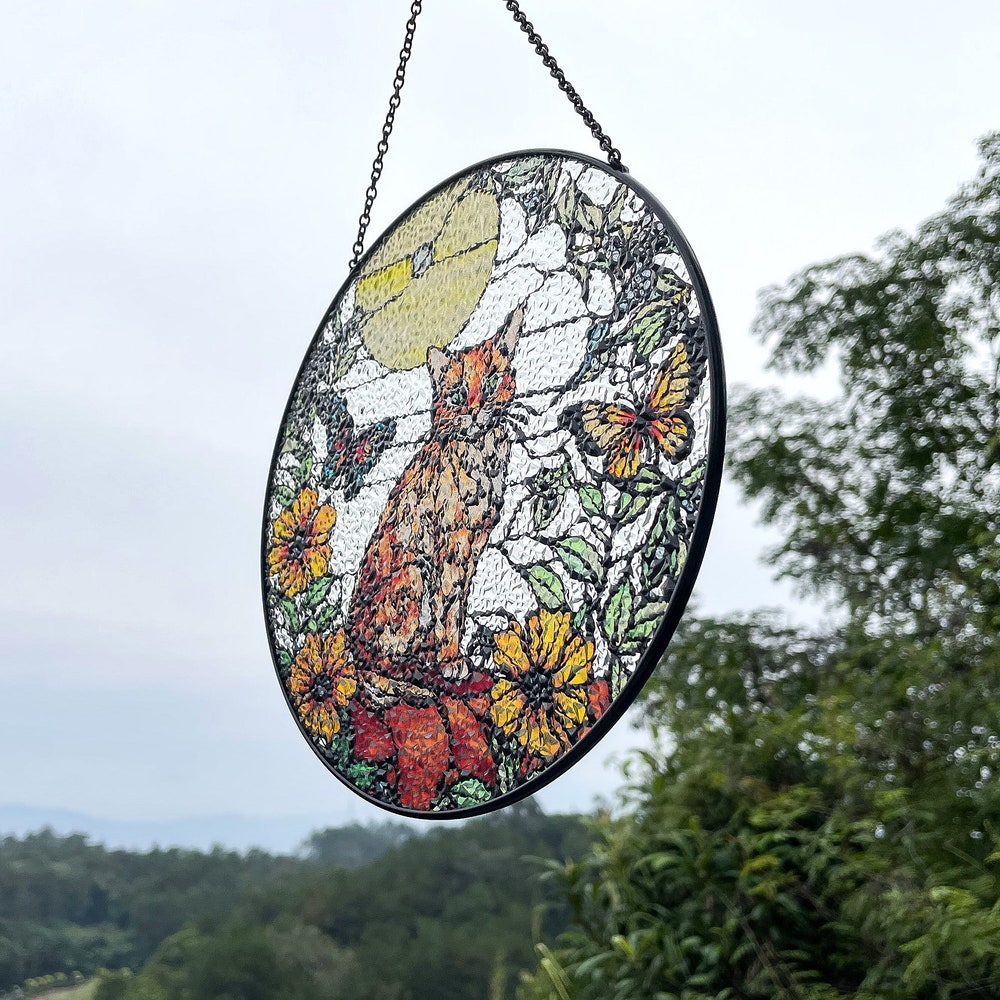 Orange Cat and Butterfly Stained Glass Suncatcher